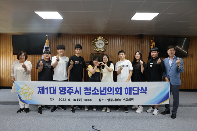 [세계타임즈=영주시 한성국 기자] 영주시의회(의장 이영호)는 18일 오전 10시 의회 본회의장에서 제1대 영주시 청소년의회 해단식을 개최하였다.