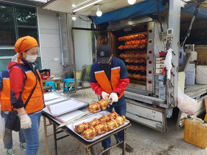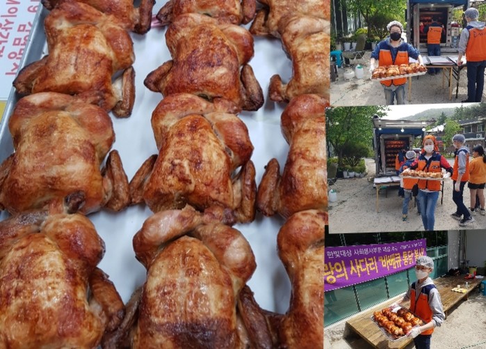 이날 봉사에는 신상일 단장을 비롯해서 김관숙 소명화 오명옥 조승찬 회원들이 주차장에서 바비큐 통닭을 구운후 구내식당으로 전달을 하였다.