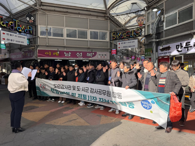 [강원도 세계타임즈=김민석 기자] 강원특별자치도 감사위원회(위원장 정일섭)는 12월 19일 ‘2025년 도민감사관 워크숍’의 일환으로 강릉 중앙시장을 방문해 도민감사관과 도·시군 감사 공무원이 함께하는 전통시장 장보기 행사를 실시했다.