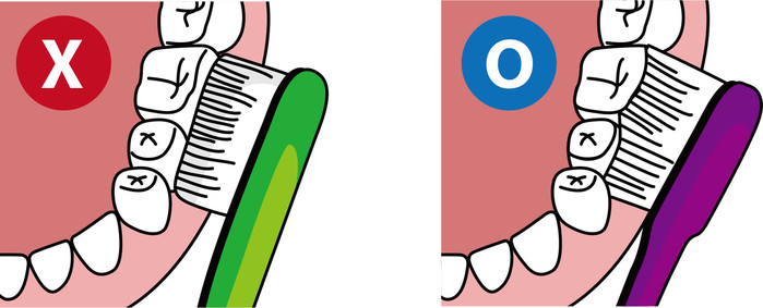 성인의 치아는 유치에 비해 길이가 길기 때문에 치아 사이가 계곡 형태가 되어 칫솔모가 닿기가 어렵다. 따라서 이때는 잇몸과 치아의 경계부를 중심으로 치간 사이에 칫솔모가 들어갈 수 있도록 힘을 주며 상하 진동하듯이 닦는 것이 좋다.