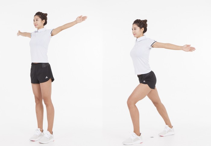 추천할 만한 전신 스트레칭법으로는 ‘가슴 쭉죽 스트레칭’이 있다. 먼저 양팔을 높이 든 채 한 쪽 다리를 앞으로 내밀며 만세를 부르듯 양팔을 쭉 뻗어 가슴을 활짝 펴준다. 이때 무릎에 체중을 실어 주는 것이 중요하다. 다시 준비자세로 돌아와 발을 바꿔 동일한 동작을 실시한다. 충분히 체온이 오를 때까지 반복해준다. 가슴 쭉쭉 스트레칭은 가슴과 등, 어깨 근육을 이완시키고 하체에도 적당한 긴장감을 주는 전신강화 운동이다.