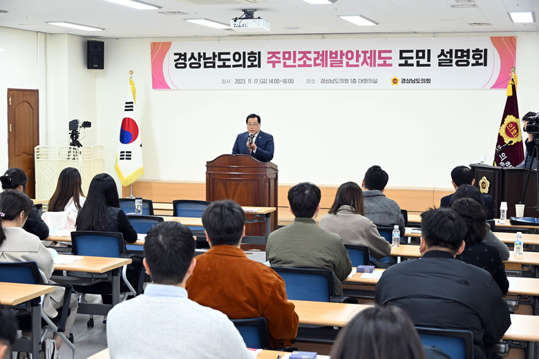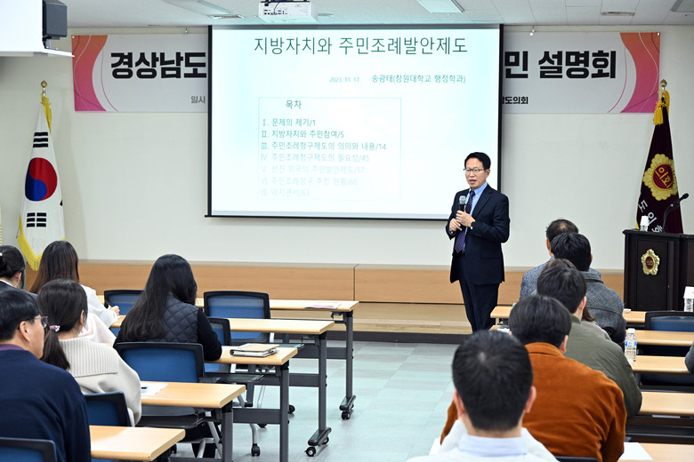 [경남 세계타임즈=최성룡 기자] 경남도의회(의장 김진부)는 11월 17일 도의회 대회의실에서 ‘주민참여 활성화를 위한 주민조례발안제도 도민 설명회’를 열었다.