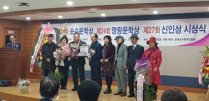 한편, 제27회 순수문학상과 제27회 신인문학상 시상식이 함께 진행된 이날 미랑 이수정 시인이 김영랑 시인의 '모란이 피기까지는' 시낭송을 하여 자리를 뜻깊게 만들었다. [세계타임즈 조원익 기자]