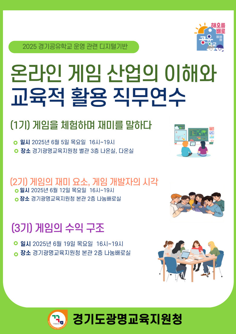 6월 5일 (목) 광명교육지원청에서 시작되는 1기‘게임을 체험하며 재미를 말하다' 에서는 직접 온라인 게임을 유형별로 체험하며 게임이 주는 즐거움의 본질을 탐구한다. 12일 (목) 에는 2기 '게임의 재미 요소: 학생들이 게임에 몰입하는 이유'와 '게임 개발자의 시각: 게임은 어떤 생각으로 만들어지는가' 를 통해 게임의 심리학적, 개발적 측면을 심도 있게 다루며 학생들이 게임에 몰입하는 이유와 개발자의 의도를 이해하도록 돕는다. 마지막 19일 (목) 에는 3기‘게임의 수익구조 ; 게임은 어떻게 돈을 벌고, 우리는 그것을 어떻게 가르칠 것인가?' 에서는 게임 산업의 경제적 측면을 분석하고, 이를 교육적으로 활용할 방안에 대해 고민하는 시간을 가질 것이다.