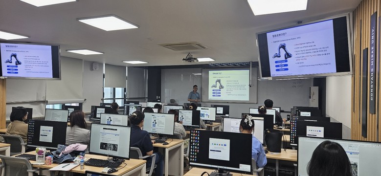 이어서 5월 29일(목) 동양미래대학교에서 진행된 '디지털 기반 학생 진로 지도를 위한 로봇 공학의 이해' 프로그램은 동양미래대학교 기계설계공학과 박종욱 교수로부터 로봇 공학의 기본 원리와 최신 동향을 알아보고 산업용 협동 로봇을 직접 조작도 해보는 시간도 가졌다.