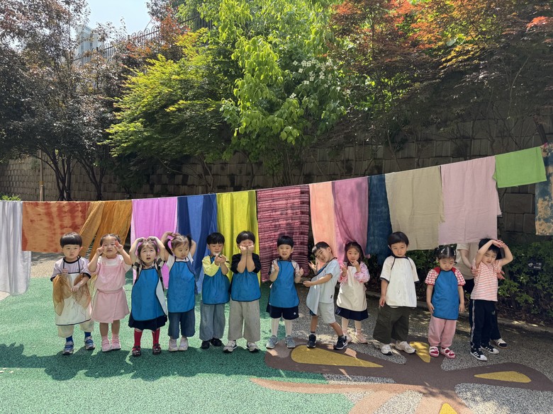 자연에서 얻은 색과 쪽 염료의 향을 느낄 수 있는 ‘쪽 염색 손가방 만들기’체험은 쪽 식물에서 추출한 천연 염료로 천을 물들이며 전통 염색의 아름다움을 배우고, 자신만의 특별한 손가방을 완성해보는 의미 있는 활동이었다. 체험이 진행되는 동안 유아들은 “예쁜 무늬가 생겨서 신기해요, 파랗게 염색된 천이 바다 같아요.”라고 말하며 의미 있는 시간을 보냈다.