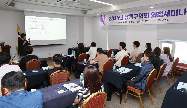 [남동구 세계타임즈=심하린 기자] 남동구의회(의장 이정순)는 지난 2일부터 사흘간 의원들의 의정활동 전반에 필요한 전문지식과 능력을 함양하고, 지방의회 의정 역량을 강화하기 위해 ‘2024년 남동구의회의정 세미나‘를 진행했다.