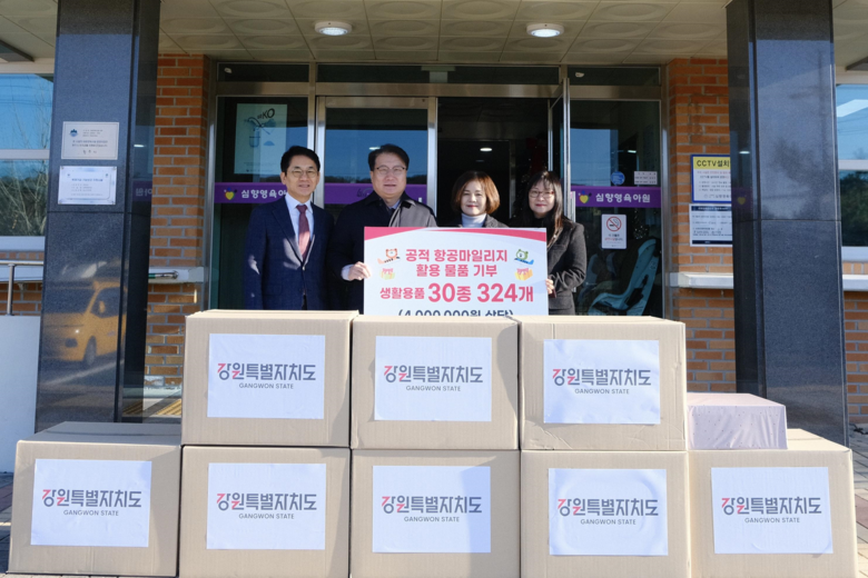 [강원도 세계타임즈=김민석 기자] 강원특별자치도는 12월 26일(금), 도청 직원들이 자발적으로 기부한 공적 항공마일리지를 활용해 약 400만 원 상당의 생활용품 320여 점을 마련해 도내 아동복지시설에 전달했다고 밝혔다.