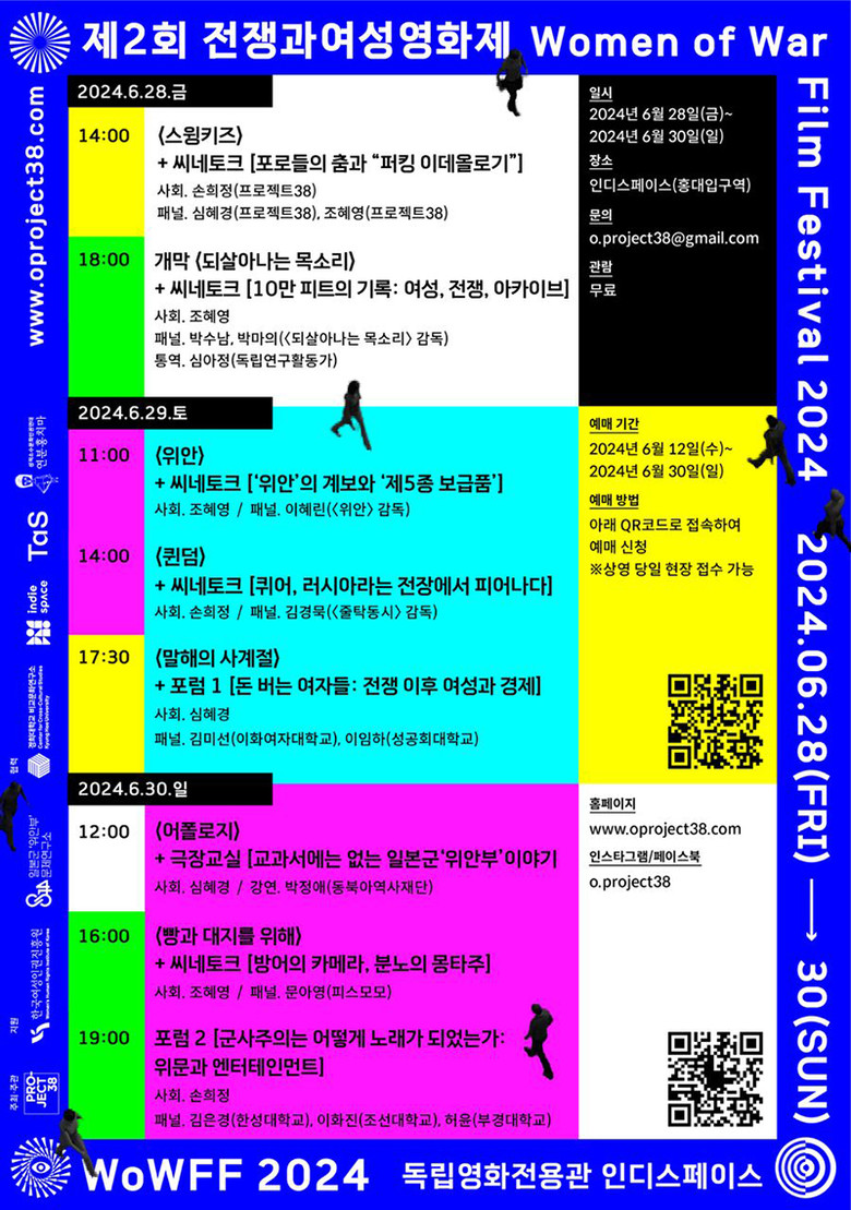 제2회 전쟁과여성영화제 상영과 토크, 포럼 등 전체 행사는 무료로 진행되며, 관람 및 참여 신청은 프로젝트38 홈페이지(https://oproject38.com/)와 인스타그램(@o.project38), 페이스북(@o.project38) 등의 SNS를 통해 확인할 수 있다.