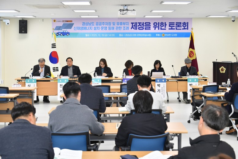 [경남 세계타임즈=최성룡 기자] 경상남도의회 한상현 의원(더불어민주당, 비례)은 19일 도의회 문화강좌실에서 「경상남도 공공주차장 및 유휴부지 신재생에너지 설치ㆍ운영 등에 관한 조례」 제정을 위한 토론회를 개최했다.