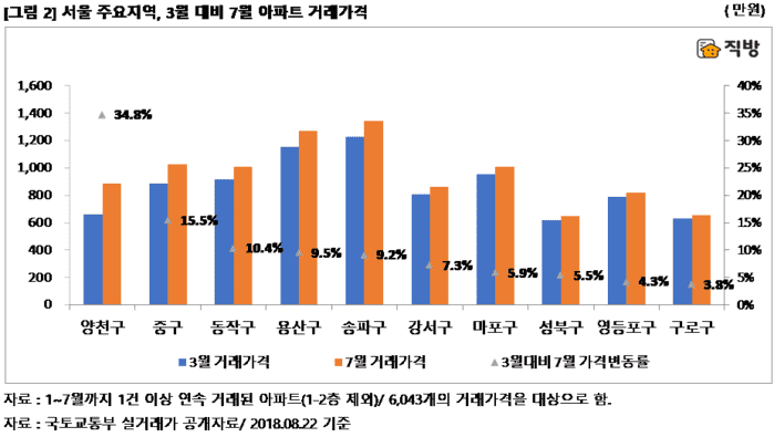 다음은 동작구가 10.4% 상승했다. 동작구는 투기지역에 속하지 않아 상대적으로 규제를 덜 받는 지역으로 매수자들의 선호도가 높아졌다. 뒤를 이어 용산구가 9.5% 거래가격이 상승했다. 용산은 7월 여의도와 융합 통합개발계획이 발표되면서 개발 기대감이 높아졌다.