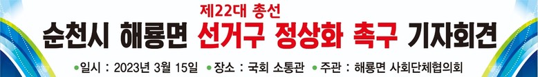 해룡면 18개 사회단체 대표들은 15일 국회에서 기자회견을 연 뒤, 남인순 더불어민주당 정개특위 위원장과 박홍근 원내대표 등을 잇따라 면담하고 '순천 해룡면 선거구 정상화'를 강력 촉구할 계획이다.