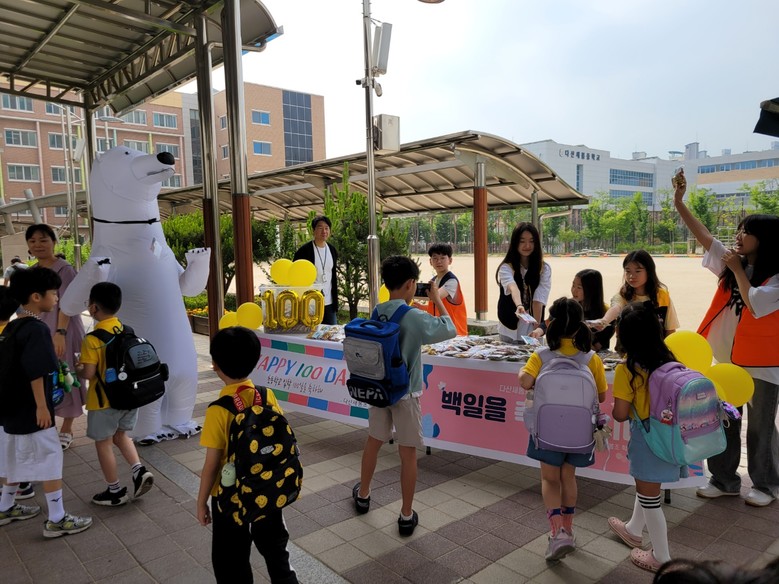 이번 행사는 작년에 이어 학생자치회 선배들이 귀엽고 소중한 1학년 후배들을 축하하기 위하여 자발적으로 마련한 행사이다. 초등학교에 첫발을 내딛은지 100일을 맞아 노란 단체티를 입고 등교하는 1학년 학생들은 교문을 들어서며 눈이 휘둥그레졌다. 환한 웃음으로 축하 인사를 건네는 교장 선생님, 하얀 북극곰 에어 슈트에 들어가 익살스러운 동작으로 반겨주는 체육 선생님, 정성껏 포장한 간식을 전해주는 학생자치회 선배들, 축하 플래카드와 응원 피켓까지 준비한 사람들의 따뜻함이 느껴지는 등굣길이었다.