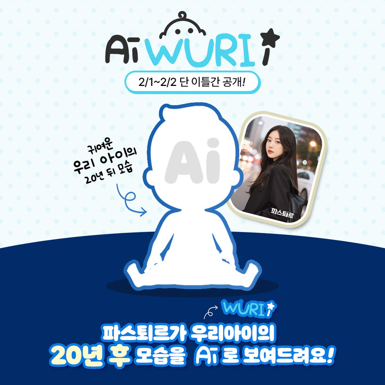 파스퇴르가 선보이는 우리 아이 미래 모습 예측 이벤트 ‘파스퇴르 Ai WURI i(우리아이)’는 AI 프로필 생성 애플리케이션 ‘캐럿’에서 참여할 수 있다. 캐럿 앱에서 ‘파스퇴르 Ai WURI i 필터’를 선택하고 우리 아이의 현재 사진을 업로드하면 생성형 AI 기술을 통해 20년 후 성장한 모습을 만나볼 수 있다. 이벤트 필터는 오는 2월 1일과 2일 단 2일동안 운영한다.
