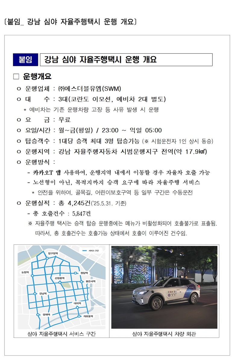 서울시의 자율주행택시 시범사업은 민간기업 ㈜에스더블유엠(SWM)과 협력해 평일 밤 11시부터 다음날 새벽 5시까지, 강남 자율주행 시범운행지구(약 17.9km)에서 무료로 운행되고 있다.