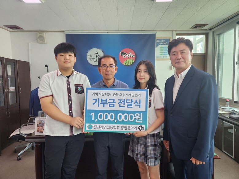 이 기부금은 오송읍 수해 복구 및 이재민 지원을 위해 쓰일 예정이며 진천상업고등학교는 매년 바른 인성 함양을 위한 교육으로 독거 어르신을 위한 목도리 뜨기와 김장 나눔 행사, 반찬 봉사 등 지역사회와 함께하는 나눔을 실천하고 있다.