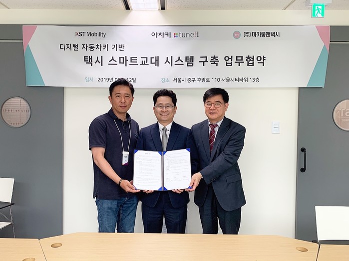 KST모빌리티가 추진하는 ‘택시 스마트 교대 시스템’은 튠잇이 개발한 ‘아차키’ 솔루션을 활용한다. 튠잇은 현대자동차 사내벤처로 시작해 올해 초 분사한 IT 기반 모빌리티 솔루션 회사로, 최근 아차키 솔루션을 시장에 선보였다. 아차키는 스마트폰을 활용한 스마트 디지털 키다. 차량 내에 설치하는 하드웨어 모듈과 사용자 스마트폰에 설치하는 전용 애플리케이션으로 구성되며 블루투스 방식으로 연결된다. 사용자는 이 솔루션을 통해 앱을 설치한 스마트폰으로 차량 문을 열거나 잠글 수 있다. 또한 디지털 키 권한을 다수의 사람들과 공유하거나 회수하는 것도 가능하다.