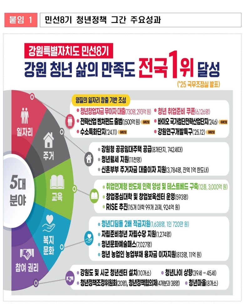 - 일자리와 정주환경 조성에 중점 투자, 첨단 미래산업 분야 청년 인력 양성 [강원도 세계타임즈=김민석 기자] 강원특별자치도(도지사 김진태)는 2월 5일(목) 「2026~2030 제2차 청년정책 기본계획」을 발표하고, 5년 간 81개 사업에 1조 3,380억 원을 투입해 청년 지원 정책을 본격 추진한다고 밝혔다.