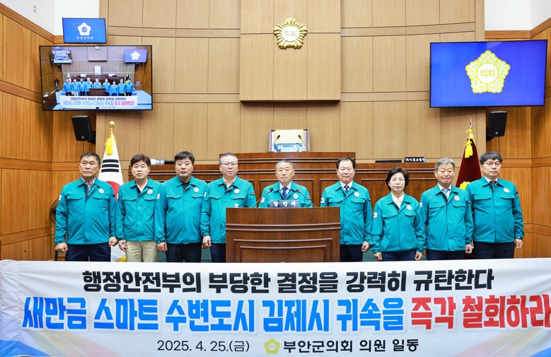 이번 성명은 지난 4월 23일, 행정안전부가 새만금 스마트 수변도시의 관할 지자체를 김제시로 최종 결정한 데 따른 조치로, 부안군의회는 이 결정에 대해 깊은 유감을 표명하며, 이는 부안군민의 희생과 공헌을 철저히 외면한 것이라고 강하게 비판하였다.