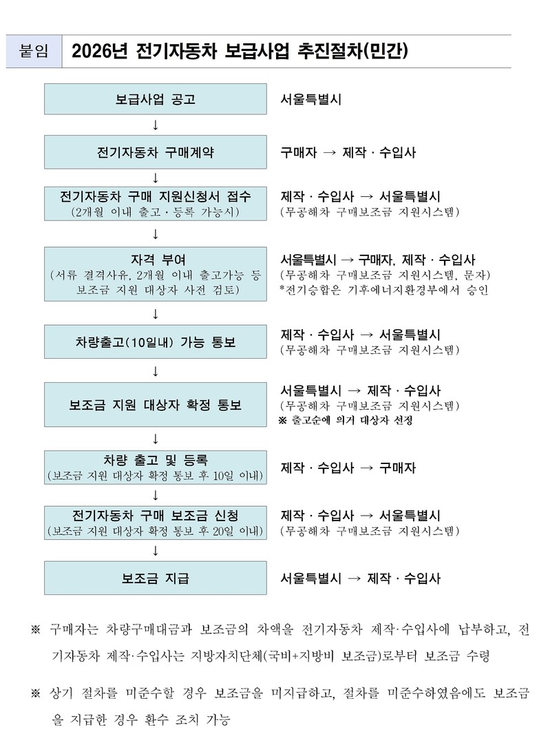전기차 신청은 1월 26일(월)부터 무공해차 통합누리집(www.ev.or.kr) 에서 가능하다. 신청 대상은 접수일 기준 서울시에 30일 이상 거주하거나 사무소를 둔 개인, 개인사업자, 법인, 공공기관 등이며, 2개월 이내 출고 가능한 차량에 한정한다.