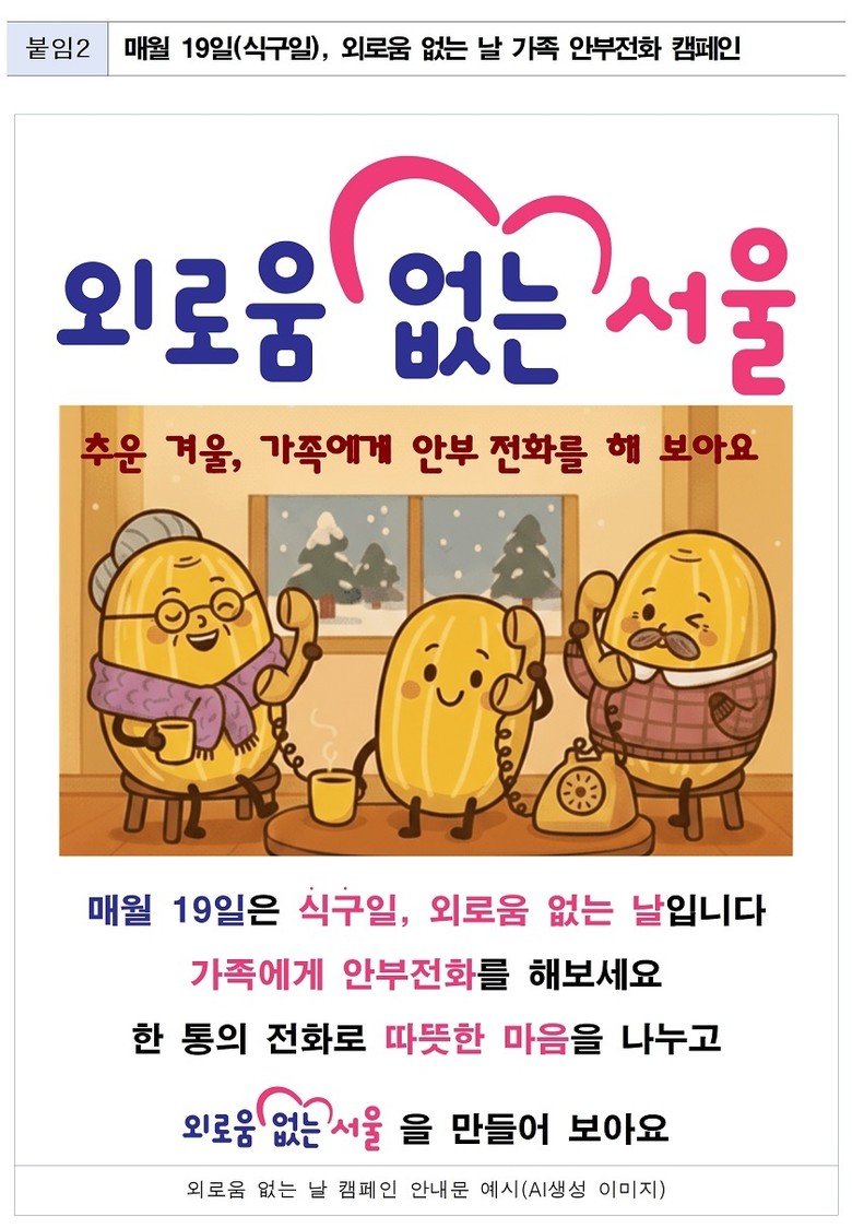 서울시는 가족의 돈독한 관계 형성뿐 아니라 고립.외로움 등 수시로 서로의 마음 건강을 챙기기 위해 오는 2월부터 매달 19일(식구일)을 ‘외로움 없는 날’로 정하고 부모.자녀, 조부모.손자녀, 형제.자매 등 멀리 떨어져 사는 가족 간 안부 전화를 독려하는 캠페인에 들어간다.