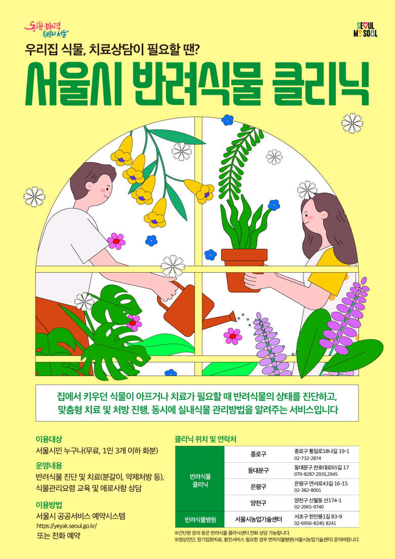 이용을 원하는 시민들은 서울시 공공서비스예약 누리집(yeyak.seoul.go.kr)에서 신청하거나 지역별 클리닉에 전화 예약 후 아픈 반려식물과 방문하면 된다. 평일 10시~17시까지 30분 단위로 선착순 신청 가능하고 1인당 최대 3개 화분까지 치료받을 수 있다. 이용료는 무료다.