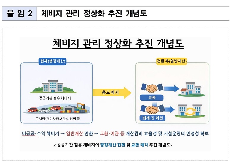 일반재산으로 전환한 8필지를 포함해 경찰청, 소방서, 교육청 등이 공공목적으로 사용 중인 체비지 총 121필지에 대해서는 점유기관별 여건을 고려해 ‘협의를 통한 교환’ 또는 ‘회계 간 유상이관’ 방식 등으로 정비한다.