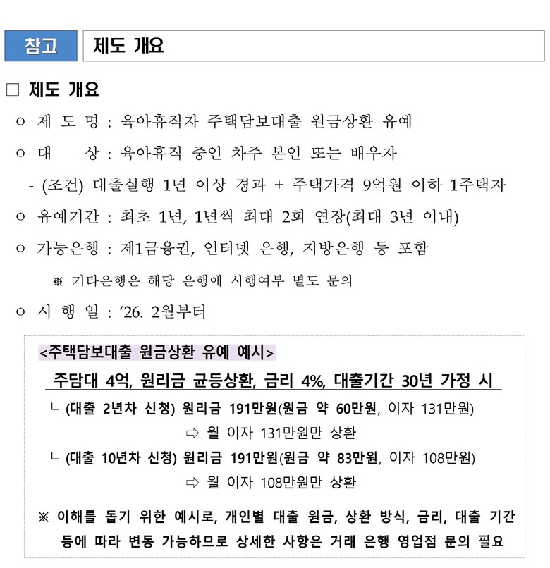 ◈ 전국의 거래 은행 영업점에서 신청 가능… 대상은 신청일 기준 차주 본인 또는 차주의 배우자가 육아휴직 중인 경우, 대출실행 1년 이상 경과, 9억 원 이하 주택 등