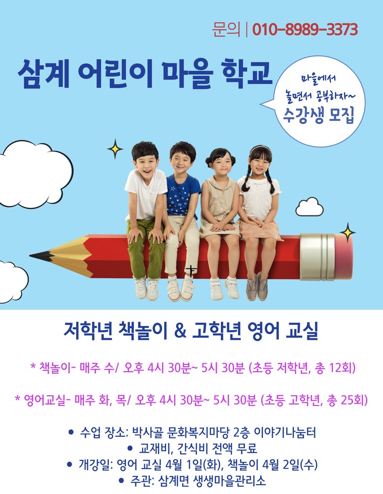 ‘삼계면 생생마을관리소’에서‘모아모아 즐거운 마을학교’라는 이름으로, 고학년 학생을 대상으로 매주 2회(화, 목) 영어 교실을 운영하고, 유아와 저학년을 대상으로 매주 수요일 책 놀이 교실을 진행하고 있다.