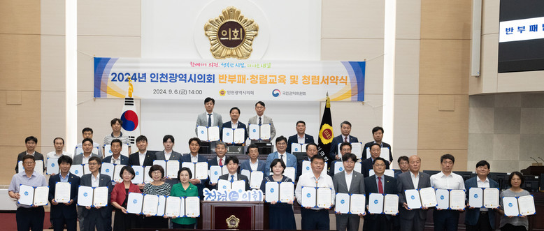 인천시의회는 지난 6일 추석 명절을 앞두고 인천시의회 본회의장에서 청렴 문화 확산과 반부패 의지 함양을 위한 ‘2024년도 반부패·청렴 교육 및 청렴 서약식’을 실시했다.
