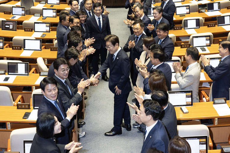 이재명 대통령, 여당 의원들 박수 받으며