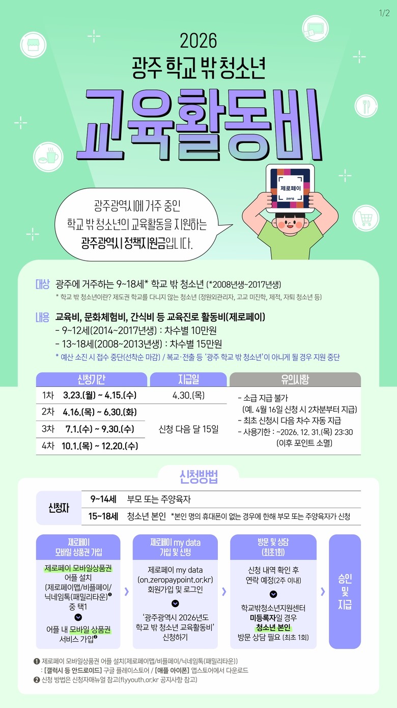 신청을 희망하는 청소년은 오는 23일부터 ‘광주광역시학교밖청소년지원센터 누리집’(www.flyyouth.or.kr)과 ‘제로페이 마이데이터 누리집(on.zeropaypoint.or.kr)’을 통해 온라인으로 접수하면 된다. 시·구 학교밖청소년지원센터는 신청자의 거주지와 자격 요건 등을 확인 후 최종 승인하며, 승인된 대상자에게는 해당 분기의 포인트가 지급된다.