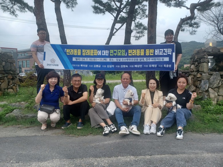 [천안시 세계타임즈=백택기 기자] 천안시의회「반려동물 장례문화에 대한 연구모임」(대표의원 복아영)은 반려동물을 동반하여 10일 부터 11일까지 1박 2일간의 일정으로 국내 1호 반려동물 공공장례식장인 ‘오수 펫 추모공원’과 반려동물 친화도시를 목표로 특화 재생 사업을 추진하는 현장, 그리고 반려동물 지원센터인 ‘오수반려누리’ 등 오수지구와 한국관광공사에서 지정된 반려동물 여행지인 전주 ‘바람쐬는길’을 견학했다.