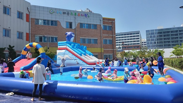 유치원 주차장에 대형 워터슬라이드 2개, 워터풀장 2개를 설치하고 슬라이드 타기, 다양한 종류의 튜브, 비치볼 등을 이용하여 물놀이를 진행하였다. 수상인명구조 자격을 갖춘 안전요원 3명 이상과 15명의학부모 자원봉사자, 5명의 유치원 교육자원봉사자 등 지원 인력을 배치하여 안전한 물놀이 체험이 될 수 있도록 운영하였다.