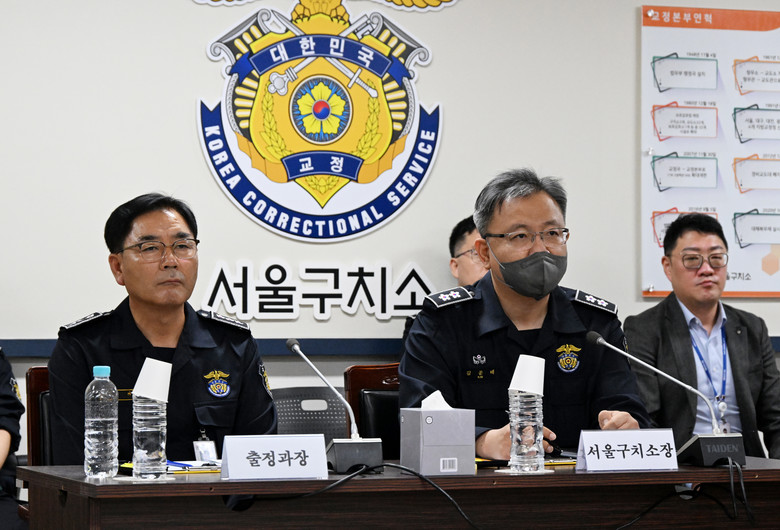 [세계타임즈 = 심귀영 기자] 김문태 서울구치소장이 19일 오전 경기도 의왕시 서울구치소에서 진행된 국회 법제사법위원회 서울구치소 현장검증에 참석해 인사말을 하고 있다. 왼쪽은 조영기 출정과장. 2024.8.19 [국회사진기자단]