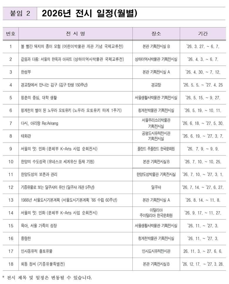 2026년 서울역사박물관(분관 포함)의 전시는 ‘서울을 빚다-세대를 넘어 잇다-서울의 멋을 짓다’라는 세 가지 축을 중심으로, 도시를 움직여 온 시스템과 그 안에 살아온 시민의 삶, 그리고 일상 속에서 문화로 축적된 서울의 정체성을 입체적으로 조망한다. 세 축은 과거-현재-미래, 그리고 도시-세대-세계를 잇는다.