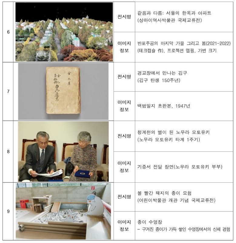 - 해외 순회전인 투어링 K-아츠 『서울의 멋: 민화』(7월~9월 바르샤바/9월~11월 로마)와 상하이역사박물관 교류전 『같음과 다름: 서울의 한옥과 아파트』(4월~6월 상하이)를 통해, 서울 일상에 깃든 K-컬처의 정수를 세계에 알린다. 조선시대 팝아트로 불리는 민화의 파격적 미감은 물론, 한국 고유의 ‘온돌’과 ‘안방’ 문화를 현대 아파트에 이식해 온 서울의 주거문화를 각각 조명한다.