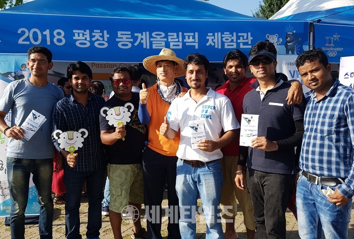 [세계타임즈 이영진 기자]지난 5일 오후 홍천읍내 토리숲 산림공원에서 홍천문화재단 주최로 제1회 홍천강맥주축제가 열리고 있는 가운데 여름휴가를 나온 삼성전자 수원사업장 소속 인도 근로자들이 축제장에 마련된 평창동계올림픽 홍보관에서 김덕만 전 홍천군홍보대사와 함께 평창올림픽 유인물을 들고 캠페인에 나서고 있다.