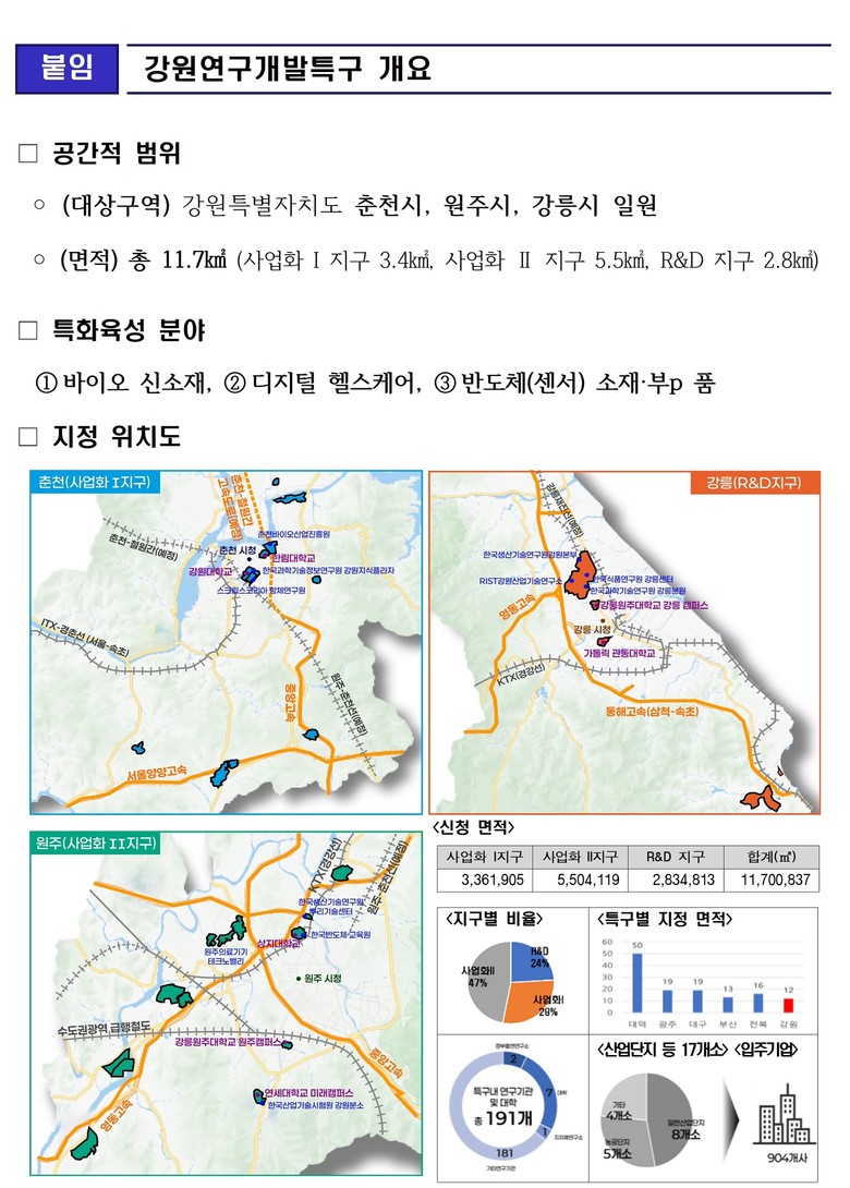이번 강원연구개발특구는 전북특구 지정(’15년) 이후 10년 만의 신규 지정으로, 바이오 신소재(춘천), 디지털 헬스케어(원주), 반도체(센서) 소재·부품(강릉) 등 3대 특화산업을 중심으로 집중 육성될 예정이다.