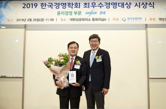 한독이 4월 26일 서울시 중구 대한상공회의소에서 개최된 ‘2019 한국경영학회 최우수경영대상’ 시상식에서 ‘경영학자들이 선정한 대한민국 최우수경영대상 윤리경영 부문’을 수상했다.