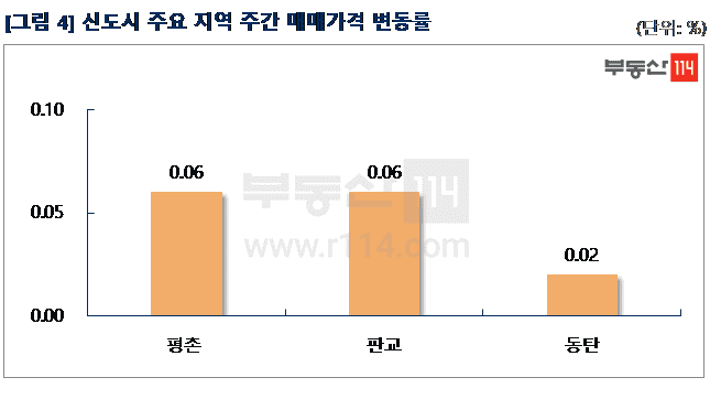 신도시는 △평촌(0.06%) △판교(0.06%) △동탄(0.02%) 등 일부 지역 빼고는 보합 수준에 머물렀다. 명절 연휴 영향으로 수요자 유입이 뜸했다. 평촌은 평촌동 초원대원과 초원대림, 초원5단지LG 등이 500만원-1,000만원 올랐다. 판교는 판교동 판교원마을9단지가 1,000만원 상승했다. 동탄은 청계동 시범계룡리슈빌, 시범예미지, 시범반도유보라아이비파크1차 등이 500만원-750만원 올랐다.