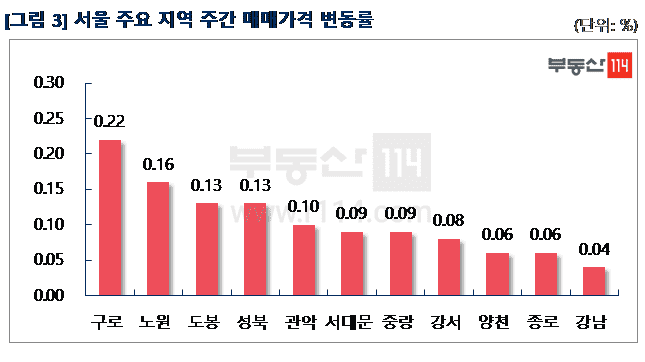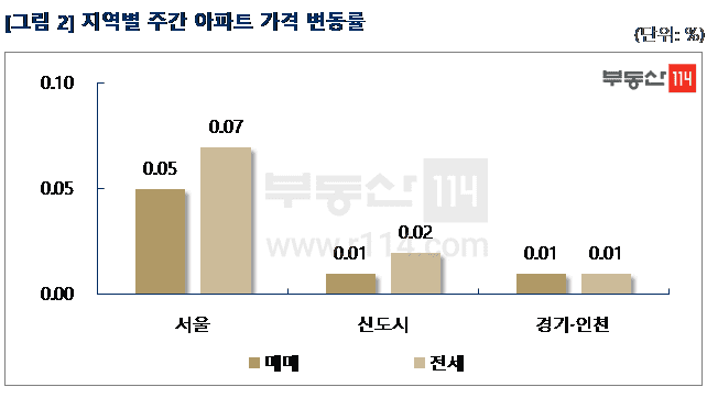 부동산114(www.r114.com)에 따르면 금주 서울 아파트값 변동률은 전주(0.06%) 대비 소폭 둔화된 0.05%를 기록했다. 재건축이 보합을 나타내며 가격 움직임이 제한된 반면, 일반 아파트는 0.06% 상승했다. 신도시는 0.01%, 경기ㆍ인천은 0.01% 올랐다.