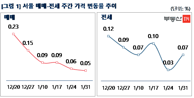 12.16대책 발표 이후 매매가격은 안정된 양상이다. 양도세 중과의 한시적 유예기간으로 정해진 올해 상반기에 매도하려는 매물들이 시장에 틈틈이 나오고 있다. 매수심리가 약화된 상황에서 선행 지표인 재건축 시장의 약세 전환도 임박했다. 강남권을 중심으로 유동성(대출)이 막히면서 비강남권의 풍선효과 움직임도 일부 확인되지만, 서울 전반의 상승세를 이끌기에는 동력이 크지 않은 상황이다. 수요층의 조심스러운 움직임은 2월에도 지속될 것으로 예상된다.