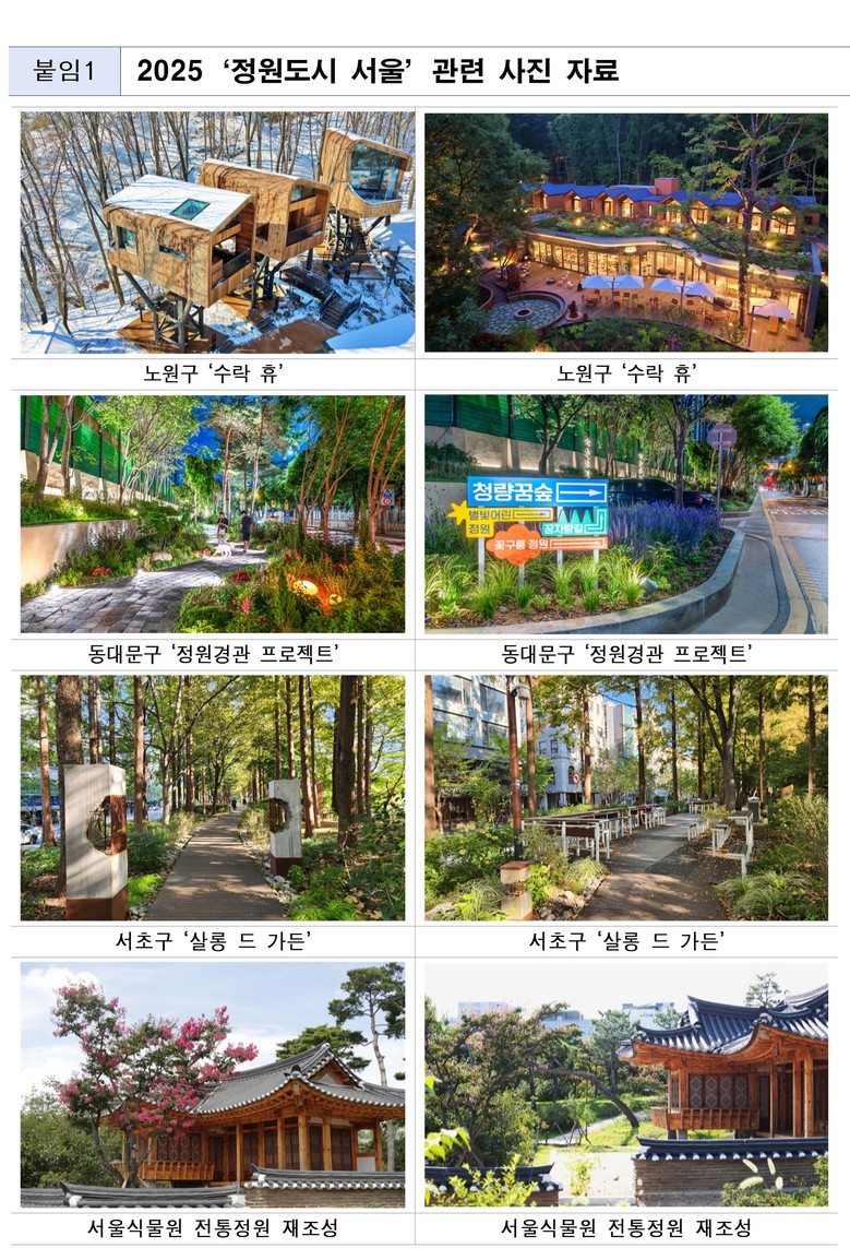 정원과 녹지는 이제 서울 관광의 중요한 자원으로 자리잡고 있다. 노원구 ‘수락 휴’는 10월「2025 한국관광데이터랩 관광자원개발 우수사례」에 선정되며 지자체가 운영하는 공공시설을 넘어 새로운 관광 모델을 제시했다는 평가를 받았고, 같은 달 「서울 뷰티웰니스 관광 100선」에도 선정되며 ‘건강하고 아름다운 서울의 일상’을 경험할 수 있는 웰니스 관광지로 인정받았다.