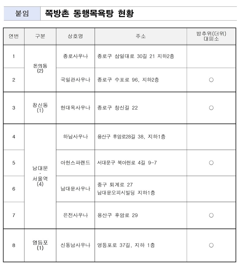 한편 동행목욕탕은 폭염과 한파를 이기는 야간 대피소로도 활용 중이다. ’23년 겨울 처음 시행된 ‘밤추위대피소’에 동행목욕탕 4곳이 참여해 60일간 2,490명이 이용했고 ’24년에는 5곳으로 확대, 기간도 90일로 늘려 5,189명에게 따뜻하고 안락한 밤을 제공했다. 지난해 말부터 시작된 올겨울에는 약 6,300명이 이용할 것으로 예상하고 있다.