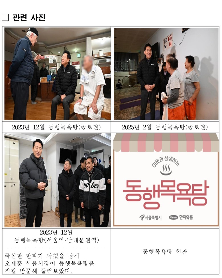 ‘동행목욕탕’은 2023년 3월 서울시가 한미약품㈜의 후원을 받아 시작한 약자동행 대표사업이다. 쪽방주민들에게는 월 2회 목욕탕 이용권을 제공하고 목욕탕은 매달 이용 횟수만큼 정산을 받는다.