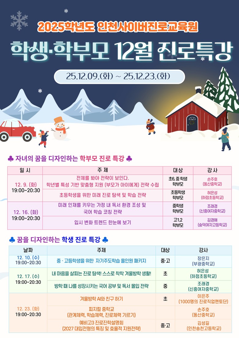 특강은 인천 관내 초·중·고 학생과 학부모 누구나 12월 3일부터 인천사이버진로교육원 누리집(https://cyberjinro.ice.go.kr/)에서 신청할 수 있으며, 모든 강의는 실시간 온라인 방식으로 진행된다.