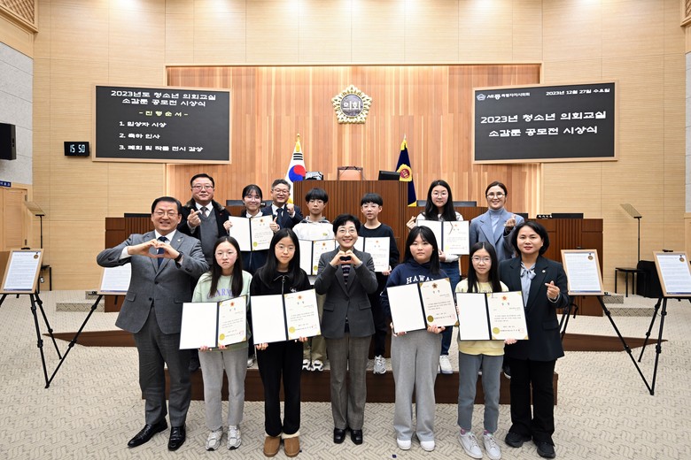 [세종 세계타임즈=이채봉 기자] 세종특별자치시의회(의장 이순열)는 27일 본회의장에서 ‘2023년 청소년 의회교실 소감문 공모전’ 시상식을 개최하고 우수작으로 뽑힌 8명에게 상장을 수여했다.