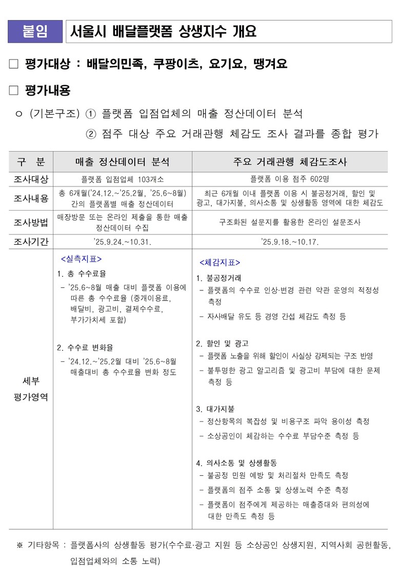 서울시는 올해 최초로 「배달플랫폼 상생지수」를 개발하여, 19일(금) 국내 주요 배달플랫폼 4개 사 대상 「2025 배달플랫폼 상생지수」 평가 결과를 발표했다. 이번 평가는 올해 6월 ‘온라인플랫폼 수수료 실태조사’ 후속 조치로, 배달플랫폼의 소상공인 상생 수준을 진단하고 플랫폼사의 자발적인 개선을 유도하기 위해 진행됐다.