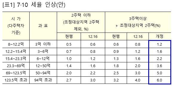 현행 일반 0.5%~2.7% 세율을 0.6%~3%로 인상하고, 3주택 이상 및 조정대상지역 2주택에는 0.6~3.2% 세율을 1.2%~6%로 인상한다. 이는 지난해 12.16대책에서 인상키로 한 세율(일반 0.1%p~0.3%p, 3주택 이상 및 조정대상지역 2주택 0.2%p~0.8%p)보다 월등히 높은 수준이다.